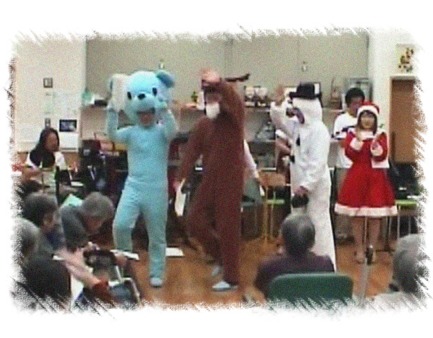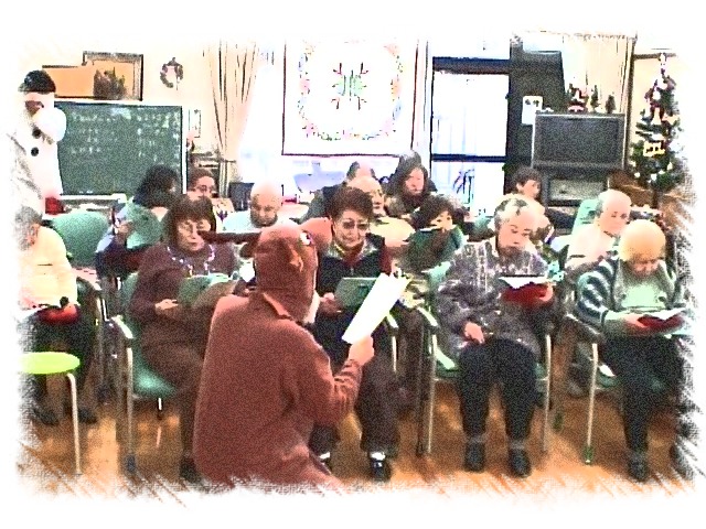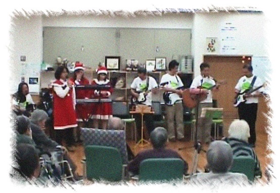 やってきましたデイサービスでの本番日。クリスマスライブの結果は、おじいちゃん・おばあちゃんに喜んでいただけたので成功といえるのでは・・・ただバンド的には今回もミス多発!点数をつけるならやはり、60〜65点といったところか!?今回はテディの企画構成が良かったのか感動されて涙されるかたもおられた。平均年齢80歳超ということもあり、アンコールのコールが企画コーナーで飛び出したりとなかなか台本通り行かず結構メンバー全員困惑しましたが、スタッフの方のサポートもあり最後の曲の「きよしこの夜」を皆で大合唱し、再アンコールの希望もあり、無事終了!今回のライブで改めてわかったことは童謡がお年寄りには受けるのだということ!