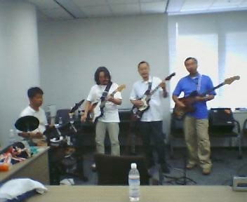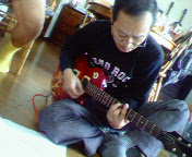 本日が最後の合同練習!会社の会議室で10:00より楽器をセットしてイザスタート!(ミッキーが寝坊してちょっと遅れて参加)午前中はセットリストに基づき流してみる。今日、スティーブンが昨日購入したエピフォンのギターを持参。午前中はこのギターで練習!