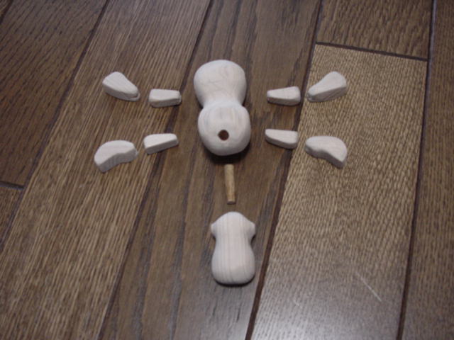 今回は製作過程ほ写真は割愛しますが、ノコとヤスリとサンドペーパーでパーツ毎に丸く削って右記の様に出来上がる。