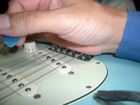 | ミュートとは、写真1のようにブリッジに手を置いて弦の振動を押さえながら弾くことをいいます。 モズライトタイプのギターはテールピース(弦の固定端)とブリッジが離れているので,手を置く場所が広く,微妙なミュートをかけやすいのですが,ストラトキャスターのタイプのギターはテールピースとブリッジが一体化しているため,慣れるまではミュートしにくいようです。 |