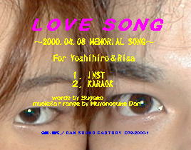 「LOVE SONG」 作詞・作曲 段無用ノ介 2000年4月8日、京都にてめでたくご 結婚をされた野田夫妻にご提供したメモリ アルソング「LOVE SONG:作詞 SUGA KO、作曲 段無用ノ介」です。ピアノとスト リングスをベースにした楽曲で英詞です。 「Love song I sing to you・・・」なんて始 まる甘〜い曲です。披露宴会場でご紹介 頂きました。評判は上々でした。 |